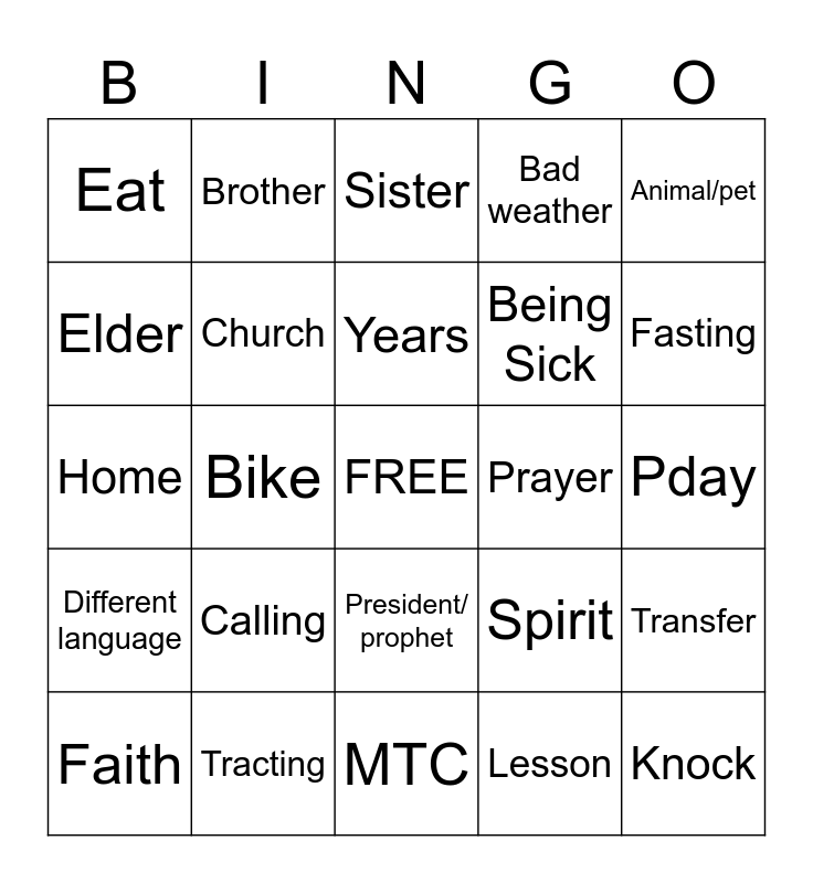 This bingo card has a free space and 29 words: Faith, Baptism, Bike, Scriptures, Eat, Sister, Church, Calling, Prayer, Tracting, Pday, Knock, MTC, Lesson, Fasting, Mission, President/ prophet, Different language, Animal/pet, Home, Spirit, Transportation, Being Sick, Elder, Bad weather, Brother, Transfer, Years and Investigator/ Friend.