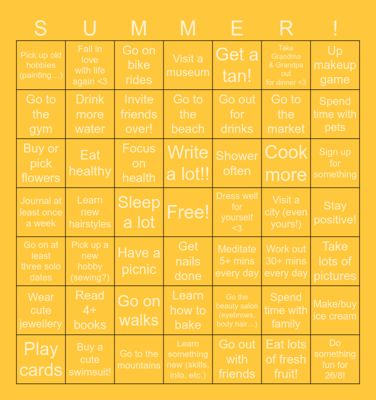 This bingo card has a free space and 48 words: Go the beauty salon (eyebrows, body hair…), Go to the market, Learn something new (skills, info, etc.), Learn new hairstyles, Focus on health, Stay positive!, Fall in love with life again <3, Buy a cute swimsuit!, Take Grandma & Grandpa out for dinner <3, Get nails done, Up makeup game, Visit a museum, Cook more, Shower often, Wear cute jewellery, Visit a city (even yours!), Go to the gym, Spend time with pets, Spend time with family, Get a tan!, Go out for drinks, Sleep a lot, Pick up old hobbies (painting…), Drink more water, Make/buy ice cream, Invite friends over!, Sign up for something, Play cards, Write a lot!!, Eat healthy, Eat lots of fresh fruit!, Dress well for yourself <3, Take lots of pictures, Read 4+ books, Journal at least once a week, Meditate 5+ mins every day, Work out 30+ mins every day, Buy or pick flowers, Have a picnic, Go on walks, Go on at least three solo dates, Do something fun for 26/8!, Go on bike rides, Go to the mountains, Go to the beach, Learn how to bake, Pick up a new hobby (sewing?) and Go out with friends.