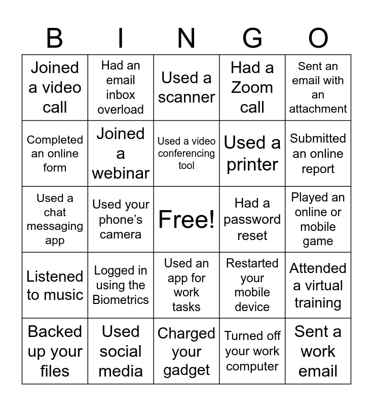 This bingo card has a free space and 24 words: Logged in using the Biometrics, Used social media, Used a video conferencing tool, Backed up your files, Sent an email with an attachment, Joined a video call, Completed an online form, Had an email inbox overload, Had a password reset, Used an app for work tasks, Used a printer, Used a chat messaging app, Restarted your mobile device, Attended a virtual training, Joined a webinar, Turned off your work computer, Played an online or mobile game, Used a scanner, Submitted an online report, Used your phone’s camera, Sent a work email, Listened to music, Had a Zoom call and Charged your gadget.