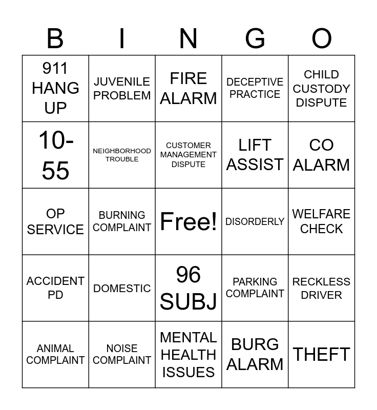 This bingo card has a free space and 24 words: DOMESTIC, NOISE COMPLAINT, CUSTOMER MANAGEMENT DISPUTE, ANIMAL COMPLAINT, CHILD CUSTODY DISPUTE, 911 HANG UP, 10-55, JUVENILE PROBLEM, DISORDERLY, 96 SUBJ, LIFT ASSIST, OP SERVICE, PARKING COMPLAINT, RECKLESS DRIVER, NEIGHBORHOOD TROUBLE, BURG ALARM, WELFARE CHECK, FIRE ALARM, CO ALARM, BURNING COMPLAINT, THEFT, ACCIDENT PD, DECEPTIVE PRACTICE and MENTAL HEALTH ISSUES.