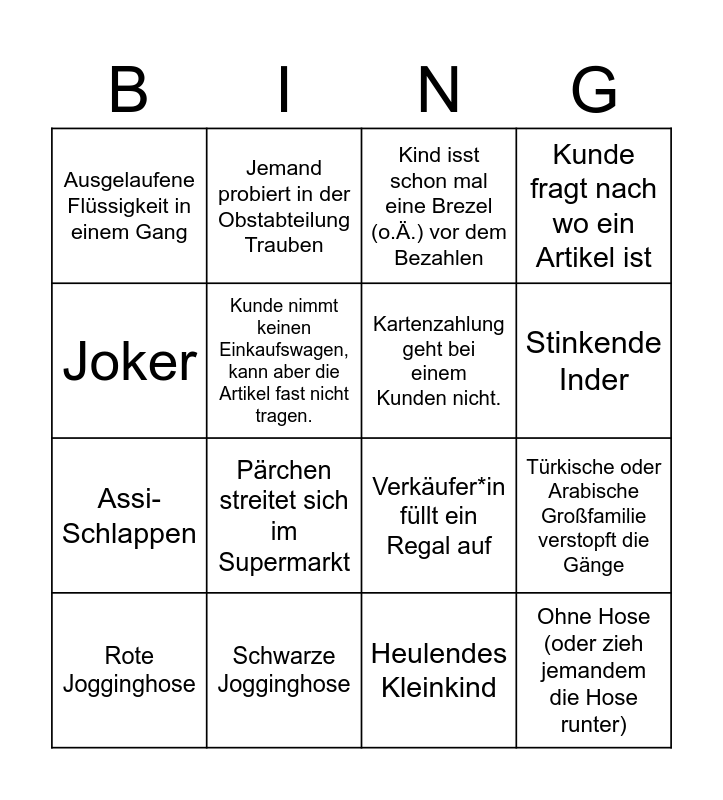 This bingo card has 16 words: Schwarze Jogginghose, Türkische oder Arabische Großfamilie verstopft die Gänge, Kind isst schon mal eine Brezel (o.Ä.) vor dem Bezahlen, Ausgelaufene Flüssigkeit in einem Gang, Assi-Schlappen, Jemand probiert in der Obstabteilung Trauben, Verkäufer*in füllt ein Regal auf, Heulendes Kleinkind, Joker, Kunde nimmt keinen Einkaufswagen, kann aber die Artikel fast nicht tragen., Rote Jogginghose, Kunde fragt nach wo ein Artikel ist, Pärchen streitet sich im Supermarkt, Stinkende Inder, Kartenzahlung geht bei einem Kunden nicht. and Ohne Hose (oder zieh jemandem die Hose runter).