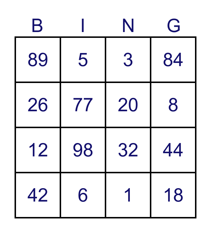 This bingo card has 16 words: 6, 44, 3, 89, 12, 5, 32, 1, 26, 77, 42, 84, 98, 8, 20 and 18.