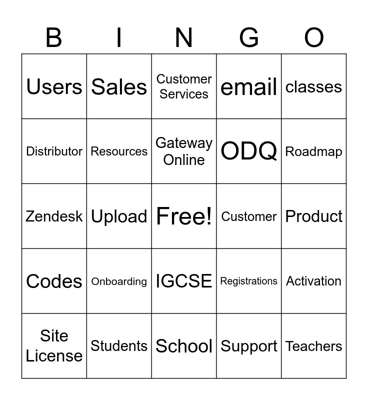 This bingo card has a free space and 25 words: Onboarding, School, Gateway Online, Site License, classes, Users, Distributor, Sales, Customer, IGCSE, ODQ, Zendesk, Registrations, Activation, Resources, Digital, Product, Customer Services, Roadmap, Upload, Teachers, Students, Codes, email and Support.