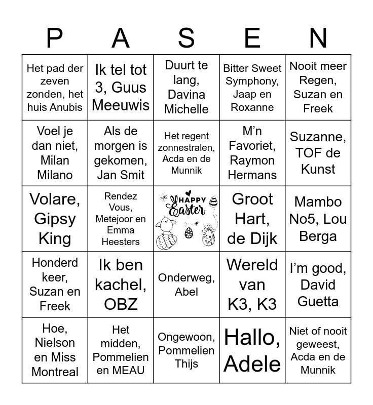 This bingo card has a free space and 39 words: Alles is liefde, Blof, Nobody’s Wife, Anouk, Sweet Goodbyes, Krezip, Als de morgen is gekomen, Jan Smit, Hoe, Nielson en Miss Montreal, Onderweg, Abel, Het regent zonnestralen, Acda en de Munnik, Padellen, Turfygang, Nooit meer Regen, Suzan en Freek, Honderd keer, Suzan en Freek, Rendez Vous, Metejoor en Emma Heesters, Bitter Sweet Symphony, Jaap en Roxanne, Niet of nooit geweest, Acda en de Munnik, Mambo No5, Lou Berga, Groot Hart, de Dijk, Ik ben kachel, OBZ, Het geheim, het huis Anubis, Het pad der zeven zonden, het huis Anubis, Just an illusion, Julia Zahra, Wereld van K3, K3, Voel je dan niet, Milan Milano, Ongewoon, Pommelien Thijs, M’n Favoriet, Raymon Hermans, Suzanne, TOF de Kunst, Ushuaia, Turfygang, Honey Honey, Mamma Mia, Blijf je vanavond, Monique Smit, Love is an open door, Frozen, Wat wil je van mij, Metejoor en Hannah Mae, Ik tel tot 3, Guus Meeuwis, Zoutelande, Blof, Goud, Suzan en Freek, Duurt te lang, Davina Michelle, Het midden, Pommelien en MEAU, Hallo, Adele, Je hoeft niet naar huis vannacht, Marco Borsato, I’m good, David Guetta, Volare, Gipsy King and Hey, soul sister, Train.