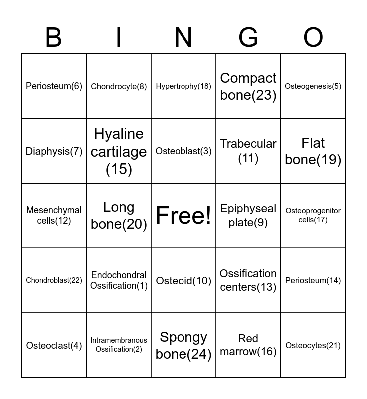 This bingo card has a free space and 24 words: Endochondral Ossification(1), Intramembranous Ossification(2), Osteoblast(3), Osteoclast(4), Osteogenesis(5), Periosteum(6), Diaphysis(7), Chondrocyte(8), Epiphyseal plate(9), Osteoid(10), Trabecular (11), Mesenchymal cells(12), Ossification centers(13), Periosteum(14), Hyaline cartilage (15), Red marrow(16), Osteoprogenitor cells(17), Hypertrophy(18), Flat bone(19), Long bone(20), Osteocytes(21), Chondroblast(22), Compact bone(23) and Spongy bone(24).