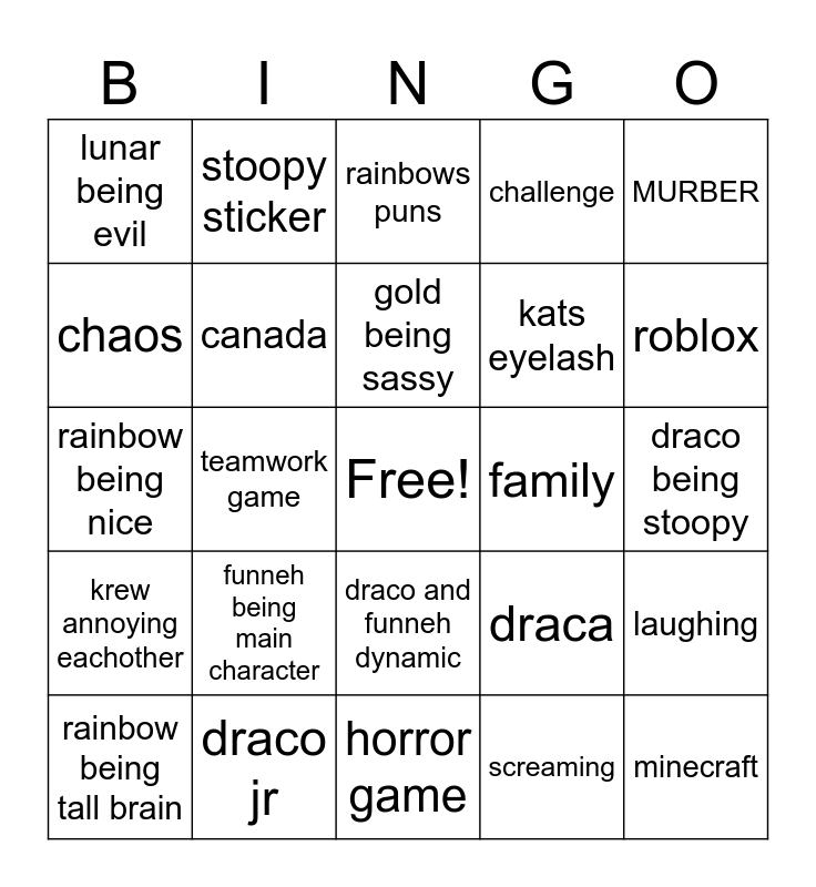This bingo card has a free space and 24 words: funneh being main character, draco jr, gold being sassy, rainbow being tall brain, MURBER, lunar being evil, chaos, stoopy sticker, family, draco and funneh dynamic, kats eyelash, rainbow being nice, draca, laughing, canada, screaming, draco being stoopy, rainbows puns, roblox, teamwork game, minecraft, krew annoying eachother, challenge and horror game.
