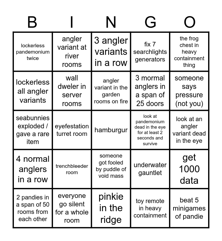 This bingo card has a free space and 34 words: 4+ dark rooms in a row, toy remote in heavy containment, someone gets fooled by good people (not you), a-60, 4 normal anglers in a row, wall dweler in server rooms, the frog chest in heavy containment thing, 2 pandies in a span of 50 rooms from each other, angler variant at river rooms, wall dweller dies, angler variant in the garden rooms on fire, 3 angler variants in a row, someone dies before you do, find a hand crancked flashlight, look at pandemonium dead in the eye for at least 2 seconds and survive, someone says pressure (not you), everyone go silent for a whole room, seabunnies exploded / gave a rare item, trenchbleeder room, underwater gauntlet, someone got fooled by puddle of void mass, dark keycard eyefestation room, lockerless pandemonium twice, look at an angler variant dead in the eye, pinkie in the ridge, beat 5 minigames of pandie, fix 7 searchlights generators, angler takes more than 10 seconds to appear in current room, 3 mormal anglers in a span of 25 doors, lockerless all angler variants, the 100 data stack, eyefestation turret room, get 1000 data and anger a candlebrute.