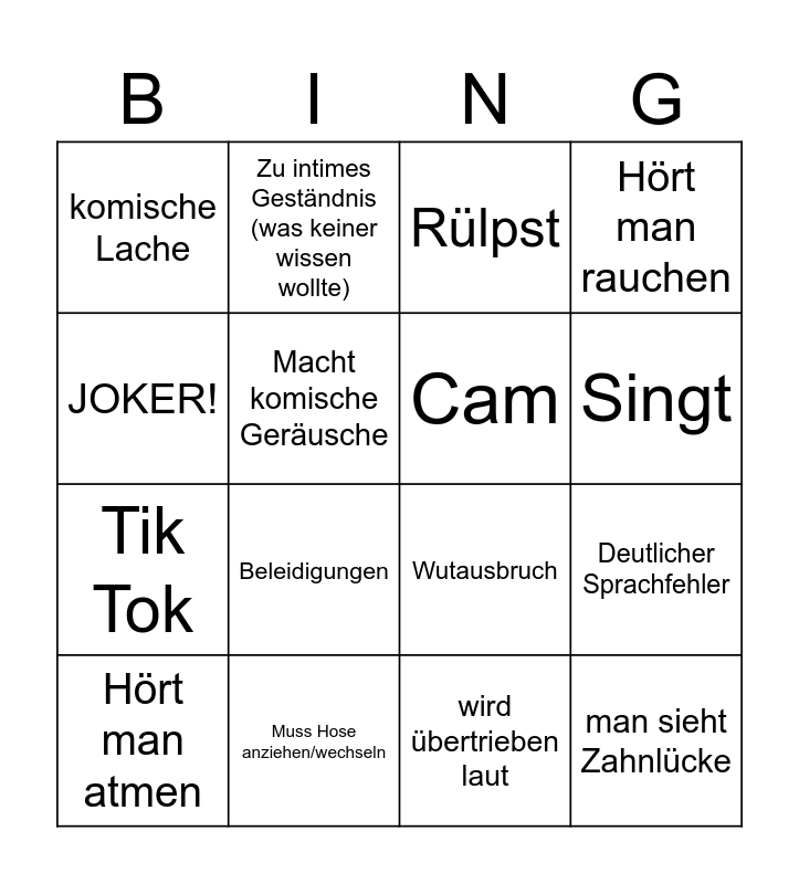 This bingo card has 16 words: Muss Hose anziehen/wechseln, Deutlicher Sprachfehler, Rülpst, komische Lache, Tik Tok, Zu intimes Geständnis (was keiner wissen wollte), Wutausbruch, wird übertrieben laut, JOKER!, Macht komische Geräusche, Hört man atmen, Hört man rauchen, Beleidigungen, Singt, Cam and man sieht Zahnlücke.