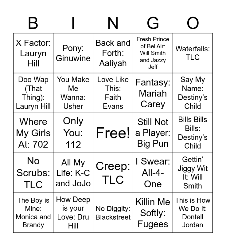 This bingo card has a free space and 24 words: All My Life: K-C and JoJo, How Deep is your Love: Dru Hill, Love Like This: Faith Evans, The Boy is Mine: Monica and Brandy, Waterfalls: TLC, X Factor: Lauryn Hill, Doo Wap (That Thing): Lauryn Hill, Pony: Ginuwine, Still Not a Player: Big Pun, Creep: TLC, Fantasy: Mariah Carey, Where My Girls At: 702, I Swear: All-4-One, Gettin’ Jiggy Wit It: Will Smith, You Make Me Wanna: Usher, Killin Me Softly: Fugees, Bills Bills Bills: Destiny’s Child, Back and Forth: Aaliyah, Say My Name: Destiny’s Child, Only You: 112, This is How We Do It: Dontell Jordan, No Scrubs: TLC, Fresh Prince of Bel Air: Will Smith and Jazzy Jeff and No Diggity: Blackstreet.