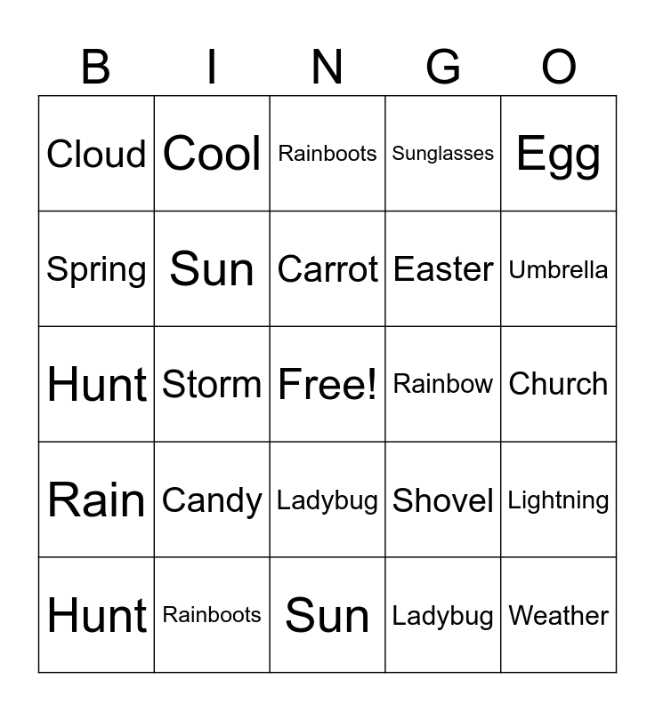 ⚠ This card has duplicate items: Basket (2), Candy (2), Carrot (2), Chocolate (2), Church (2), Cloud (2), Cool (2), Duck (2), Easter (2), Egg (2), Hunt (2), Jacket (2), Ladybug (2), Lightning (2), Plant (verb) (2), Rain (2), Rainboots (2), Rainbow (2), Shovel (2), Spring (2), Storm (2), Sun (2), Sunglasses (2), Umbrella (2), Weather (2), Wind (2)