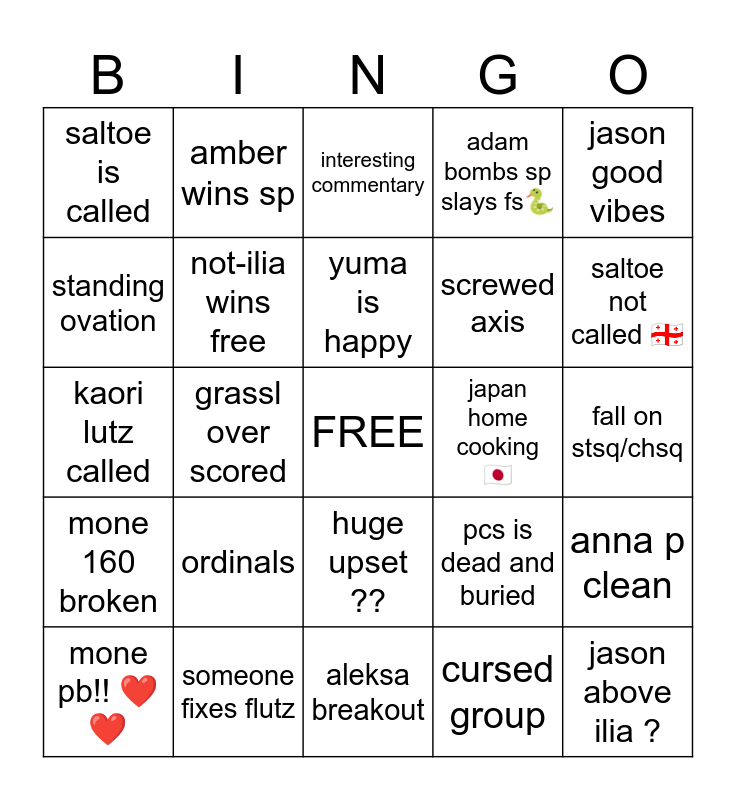 This bingo card has a free space and 24 words: ordinals, someone fixes flutz, yuma is happy, mone pb!! ❤️❤️, jason good vibes, saltoe is called, standing ovation, amber wins sp, japan home cooking 🇯🇵, huge upset ??, screwed axis, kaori lutz called, pcs is dead and buried, anna p clean, not-ilia wins free, cursed group, fall on stsq/chsq, interesting commentary, saltoe not called 🇬🇪, grassl over scored, jason above ilia ?, mone 160 broken, adam bombs sp slays fs🐍 and aleksa breakout.