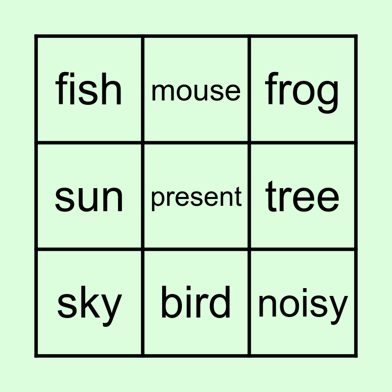 This bingo card has a free space and 14 words: garden, cloud, sky, mouse, sun, noisy, quiet, pond, bird, fish, flower, tree, frog and card.