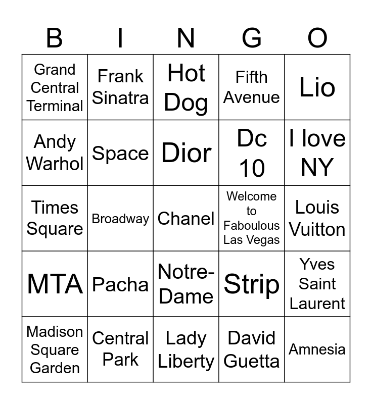 This bingo card has a free space and 89 words: Tour Eiffel, Louvre, Notre-Dame, Moulin Rouge, Baguette, Croissant, Arc de Triomphe, Gioconda, Sacre Coeur, Versailles, Louis XIV, Napoleon, Yves Saint Laurent, Louis Vuitton, ?, Dior, Paris Saint German, Brigitte Bardot, La Seine, Les Miserables, French Flag, Champs Elysėe, Lady Liberty, Empire State Building, Times Square, Central Park, Brooklyn Bridge, One World Trade Center, Chrysler Building, Wall Street, Fifth Avenue, Broadway, Rockefeller Center, Grand Central Terminal, Hamburger, Hot Dog, Andy Warhol, Taxy, I love NY, Madison Square Garden, MTA, Starbuks, Donuts, Woody Allen, Strip, Welcome to Faboulous Las Vegas, Bellagio, Cesar Palace, Elvis, Frank Sinatra, Slot, Casino, Sphere, David Copperfield, Roulette, Poker, Black Jack, The Hangover, U.S. Flag, Playing Cards, Fiches, Cirque du Soleil, Nevada desert, Blue Man Group, Uncle Sam, Dalt Villa, Cala Comte, Es vedrà, Cafe del Mar, Pacha, Amnesia, Ushuaia, Hi, Dc 10, Space, David Guetta, Flower power, Formentera, Hippie market, Playa d’en Bossa, Lio, Pereira, Spain Flag, Paella, Sangria, Ball Pages, Hierbas, ?? and Twiins.