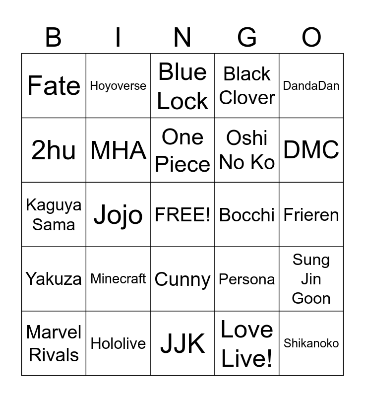 This bingo card has a free space and 24 words: Minecraft, Hololive, One Piece, Marvel Rivals, DandaDan, Fate, 2hu, Hoyoverse, Bocchi, Cunny, Oshi No Ko, Kaguya Sama, Persona, Sung Jin Goon, MHA, Love Live!, Frieren, Blue Lock, DMC, Jojo, Shikanoko, Yakuza, Black Clover and JJK.