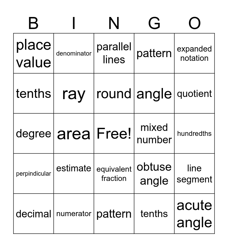 This bingo card has a free space and 25 words: estimate, pattern, round, decimal, expanded notation, place value, tenths, denominator, mixed number, equivalent fraction, angle, degree, obtuse angle, line segment, ray, symmetry, hundredths, parallel lines, quotient, area, acute angle, numerator, perpindicular, pattern and tenths.