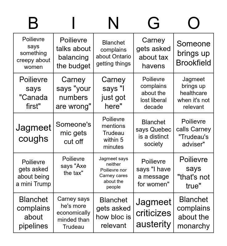 This bingo card has a free space and 24 words: Poilievre says "Axe the tax", Carney says he's more economically minded than Trudeau, Carney says "I just got here", Blanchet complains about pipelines, Someone brings up Brookfield, Poilievre says something creepy about women, Poilievre says "Canada first", Poilievre talks about balancing the budget, Blanchet says Quebec is a distinct society, Jagmeet says neither Poilievre nor Carney cares about the people, Poilievre complains about the lost liberal decade, Jagmeet coughs, Poilievre says "I have a message for women", Poilievre says "that's not true", Carney says "your numbers are wrong", Jagmeet criticizes austerity, Poilievre calls Carney "Trudeau's adviser", Blanchet complains about Ontario getting things, Jagmeet brings up healthcare when it's not relevant, Someone's mic gets cut off, Blanchet complains about the monarchy, Poilievre gets asked about being a mini Trump, Carney gets asked about tax havens and Blanchet gets asked how bloc is relevant.