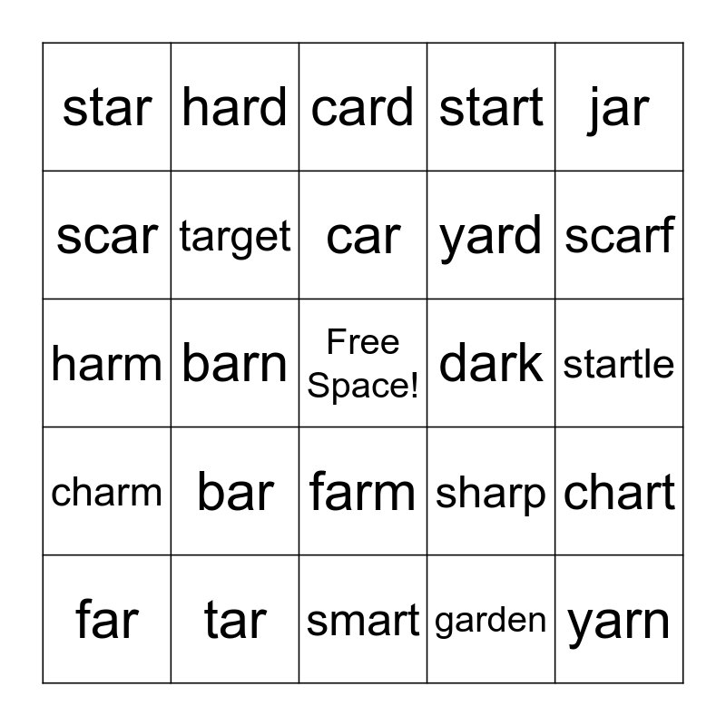 This bingo card has a free space and 24 words: bar, tar, car, far, jar, star, scar, hard, dark, farm, yard, harm, sharp, chart, target, garden, startle, card, scarf, barn, yarn, charm, start and smart.