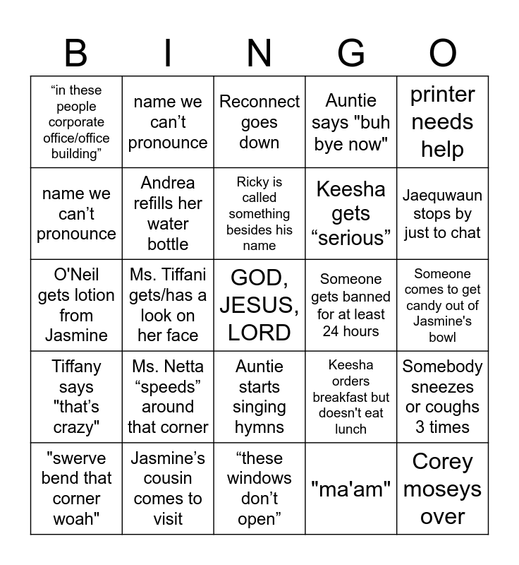 This bingo card has a free space and 24 words: Ms. Netta “speeds” around that corner, Jasmine’s cousin comes to visit, Ricky is called something besides his name, "swerve bend that corner woah", printer needs help, “in these people corporate office/office building”, name we can’t pronounce, name we can’t pronounce, Someone gets banned for at least 24 hours, Auntie starts singing hymns, Keesha gets “serious”, O'Neil gets lotion from Jasmine, Keesha orders breakfast but doesn't eat lunch, Somebody sneezes or coughs 3 times, Andrea refills her water bottle, "ma'am", Someone comes to get candy out of Jasmine's bowl, Reconnect goes down, Jaequwaun stops by just to chat, Ms. Tiffani gets/has a look on her face, Corey moseys over, Tiffany says "that’s crazy", Auntie says "buh bye now" and “these windows don’t open”.