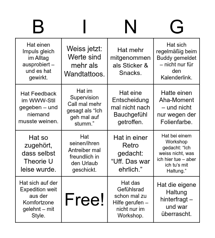 This bingo card has 21 words: Free!, Hat sich selbst auf der Expedition besser kennengelernt – ohne Navi., Weiss jetzt: Werte sind mehr als Wandtattoos., Hat einen Safe Space erlebt und sich dabei echt sicher gefühlt., Hat das Gefühlsrad schon mal zu Hilfe gerufen – nicht nur im Workshop., Hat eine Entscheidung mal nicht nach Bauchgefühl getroffen., Hat einen Impuls gleich im Alltag ausprobiert – und es hat gewirkt., Hat mehr mitgenommen als Sticker & Snacks., Hat in einer Retro gedacht: “Uff. Das war ehrlich.”, Hatte einen Aha-Moment – und nicht nur wegen der Folienfarbe., Hat so zugehört, dass selbst Theorie U leise wurde., Hat sich regelmäßig beim Buddy gemeldet – nicht nur für den Kalenderlink., Hat die eigene Haltung hinterfragt – und war überrascht., Hat sich selbst einen Brief geschrieben und beim Lesen feuchte Augen riskiert., Hat im Supervision Call mal mehr gesagt als “Ich geh mal auf stumm.”, Weiss jetzt: “Stärken stärken” ist keine Management-Floskel., Hat sich auf der Expedition weit aus der Komfortzone gelehnt – mit Style., Hat seinen/ihren Antreiber mal freundlich in den Urlaub geschickt., Hat Feedback im WWW-Stil gegeben – und niemand musste weinen., Hat bei einem Workshop gedacht: “Ich weiss nicht, was ich hier tue – aber ich tu’s mit Haltung.” and Hat ins Plenum geredet obwohl die innere Stimme "Lass es!" flüsterte..