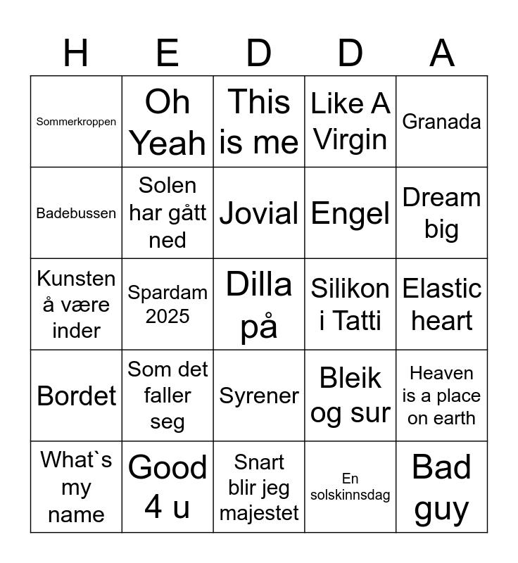 This bingo card has 48 words: Forelska i lærer`n, Dilla på, Bestevænna, Snart blir jeg majestet, Som det faller seg, Du gjør mæ så gla`, Oh Yeah, La den gå, Badebussen, Beauty and a beat, Solen har gått ned, Like A Virgin, Heaven is a place on earth, Bleik og sur, Elektrisk, Pattaya, Jovial, Silikon i Tatti, God sommer, Granada, Spardam 2025, En solskinnsdag, Sommerkroppen, Engel, Det er fredag, Dream big, What`s my name, Det var så lite, Syrener, Bordet, Galileo, Ring meg, Drivers license, Sexy and I know it, Good 4 u, Den finast eg veit, Kjærlighet er mer enn forelskelse, Elastic heart, Bohemian Rhapsody, Thunderstruck, Wicked game, Bad guy, This is me, Fångad av en stormvind, Kunsten å være inder, Klikk, Purple hat and Den grusomme medda`n.