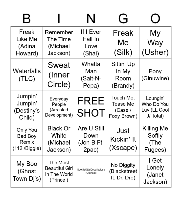 This bingo card has a free space and 52 words: All My Life (K-Ci & JoJo), I Get Lonely (Janet Jackson), Return Of The Mack (Mark Morrison), SpottieOttieDopaliscious (OutKast), Black Or White (Michael Jackson), Always Be My Baby (Mariah Carey), Remember The Time (Michael Jackson), Water Runs Dry (Boyz II Men), Waterfalls (TLC), Nobody (Keith Sweat), Sweat (Inner Circle), I Believe I Can Fly (R. Kelly), Killing Me Softly (The Fugees), Just Kickin' It (Xscape), Are You That Somebody? (Aaliyah), On & On (Erykah Badu), Whatta Man (Salt-N-Pepa), Touch Me, Tease Me (Case / Foxy Brown), Real Love (Maryj Blige), My Way (Usher), Everyday People (Arrested Development), No Diggity (Blackstreet ft. Dr. Dre), Freak Like Me (Adina Howard), Sittin' Up In My Room (Brandy), Candy Rain (Soul For Real), Don't Take It Personal (Monica), Bump N' Grind (R. Kelly), Lady (D'Angelo), Pony (Ginuwine), Knockin' Da Boots (H-Town), The Boy Is Mine (Brandy & Monica), Freak Me (Silk), End Of The Road (Boyz II Men), I Wanna Be Down (Brandy), Weak (SWV), If I Ever Fall In Love (Shai), The Most Beautiful Girl In The World (Prince ), Say My Name (Destiny's Child), That's The Way Love Goes (Janet Jackson), Love U 4 Life (Jodeci), You Used To Love Me (Faith Evans ), Loungin' Who Do You Luv (LL Cool J/ Total), Only You Bad Boy Remix (112 /Biggie), I'm So Into You (SWV), Are U Still Down (Jon B Ft. 2pac), Can We Talk (Tevin Campbell), Baby (Brandy), Jumpin' Jumpin' (Destiny's Child), Sitting Home (Total), Right Here Human Nature (SWV), My Boo (Ghost Town Dj's) and Don't Leave Me (Blackstreet).
