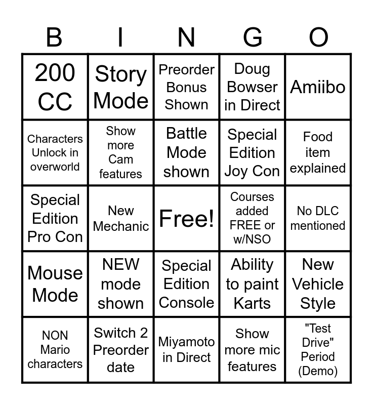 This bingo card has a free space and 24 words: NEW mode shown, Switch 2 Preorder date, Battle Mode shown, NON Mario characters, Amiibo, 200 CC, Characters Unlock in overworld, Story Mode, Courses added FREE or w/NSO, Special Edition Console, Special Edition Joy Con, Special Edition Pro Con, Ability to paint Karts, New Vehicle Style, Show more Cam features, Show more mic features, No DLC mentioned, Preorder Bonus Shown, Food item explained, New Mechanic, "Test Drive" Period (Demo), Mouse Mode, Doug Bowser in Direct and Miyamoto in Direct.