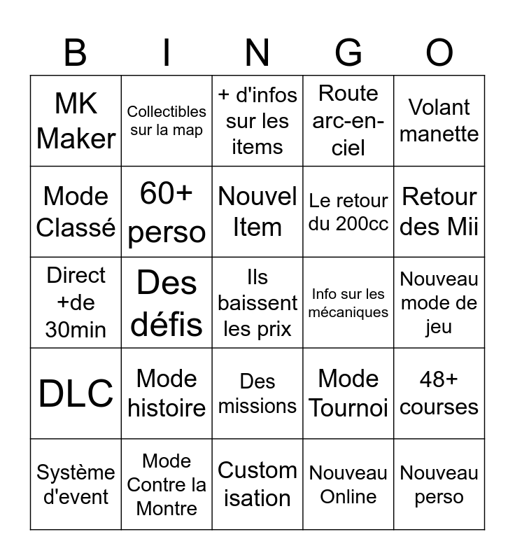 This bingo card has a free space and 24 words: Mode histoire, Mode Contre la Montre, Nouvel Item, Système d'event, Volant manette, MK Maker, Mode Classé, Collectibles sur la map, Info sur les mécaniques, Des missions, Le retour du 200cc, Direct +de 30min, Mode Tournoi, 48+ courses, 60+ perso, Nouveau Online, Nouveau mode de jeu, + d'infos sur les items, Retour des Mii, Des défis, Nouveau perso, DLC, Route arc-en-ciel and Custom isation.