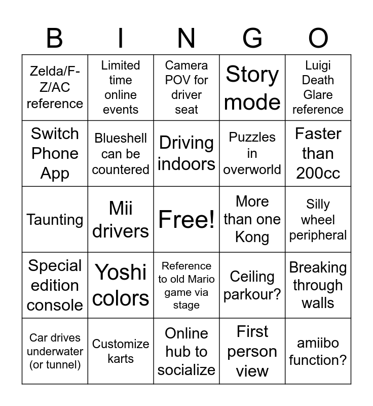 This bingo card has a free space and 24 words: Yoshi colors, Customize karts, Driving indoors, Car drives underwater (or tunnel), Luigi Death Glare reference, Zelda/F-Z/AC reference, Switch Phone App, Limited time online events, More than one Kong, Reference to old Mario game via stage, Puzzles in overworld, Taunting, Ceiling parkour?, Breaking through walls, Blueshell can be countered, First person view, Silly wheel peripheral, Camera POV for driver seat, Faster than 200cc, Mii drivers, amiibo function?, Special edition console, Story mode and Online hub to socialize.