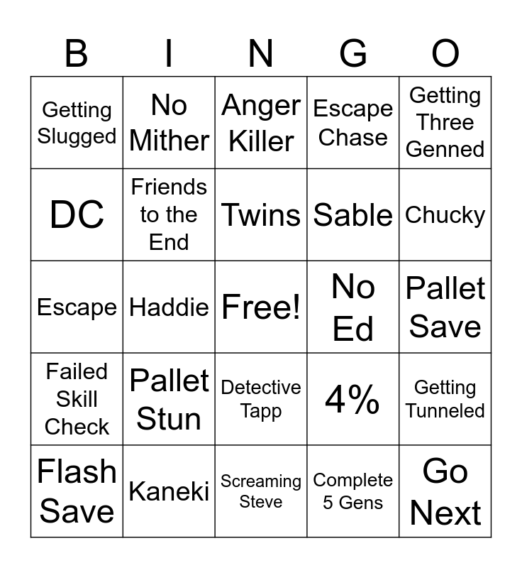 This bingo card has a free space and 24 words: Pallet Stun, Kaneki, Twins, Flash Save, Getting Three Genned, Getting Slugged, DC, No Mither, No Ed, Detective Tapp, Sable, Escape, 4%, Getting Tunneled, Friends to the End, Complete 5 Gens, Pallet Save, Anger Killer, Chucky, Haddie, Go Next, Failed Skill Check, Escape Chase and Screaming Steve.