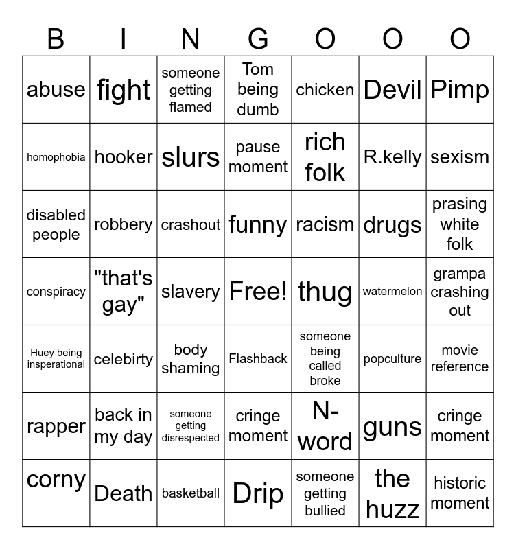 This bingo card has a free space and 48 words: N-word, R.kelly, Drip, "that's gay", crashout, grampa crashing out, fight, Death, Devil, Flashback, Pimp, Tom being dumb, drugs, racism, rapper, watermelon, homophobia, sexism, guns, chicken, rich folk, slavery, abuse, hooker, cringe moment, slurs, prasing white folk, corny, funny, robbery, the huzz, thug, movie reference, back in my day, conspiracy, someone being called broke, popculture, disabled people, body shaming, someone getting disrespected, Huey being insperational, historic moment, someone getting flamed, basketball, pause moment, cringe moment, celebirty and someone getting bullied.