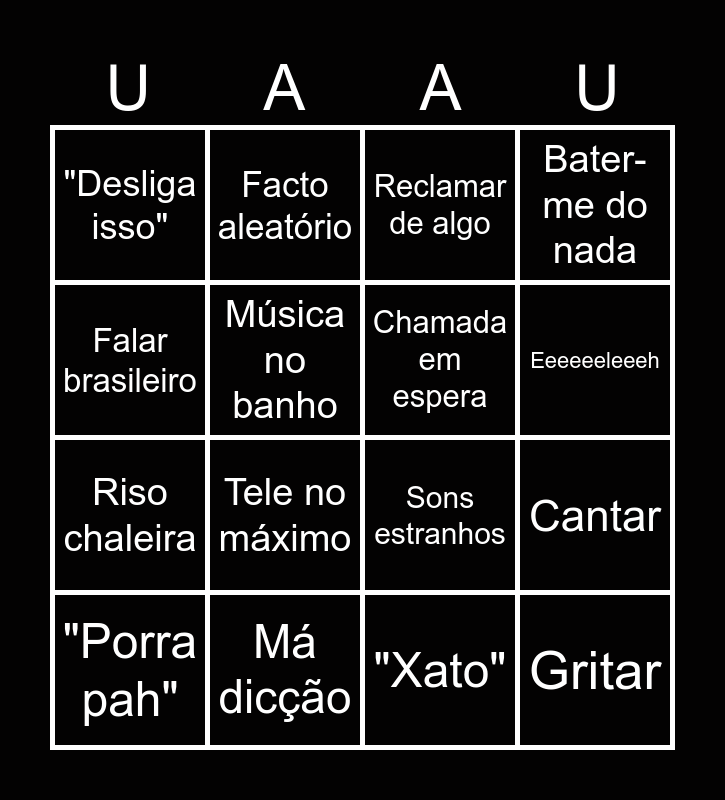 This bingo card has 19 words: Sons estranhos, Figuras estranhas, Reclamar de algo, Gritar, Cantar, Falar brasileiro, "Xato", "Desliga isso", Facto aleatório, Riso chaleira, Tele no máximo, Música no banho, Chamada em espera, Má dicção, "Porra pah", Susto biológico, Bater-me do nada, Eeeeeeleeeh and Anhanha.