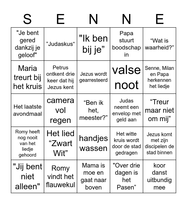 This bingo card has a free space and 24 words: "Jij bent niet alleen", Het lied “Zwart Wit”, Jezus wordt gearresteerd, "Over drie dagen is het Pasen”, “Wat is waarheid?”, "Je bent gered dankzij je geloof", ”Judaskus“, "Ik ben bij je”, Judas neemt een envelop met geld aan, “Treur maar niet om mij”, Het laatste avondmaal, Petrus ontkent drie keer dat hij Jezus kent, Het witte kruis wordt door de stad gedragen, Jezus komt met zijn discipelen de stad binnen, Maria treurt bij het kruis, Romy vindt het flauwekul, Mama is moe en gaat naar boven, Papa stuurt boodschap in, Senne, Milan en Papa herkennen het liedje, Romy heeft nog nooit van het liedje gehoord, camera vol regen, handjes wassen, valse noot and koor danst uitbundig mee.