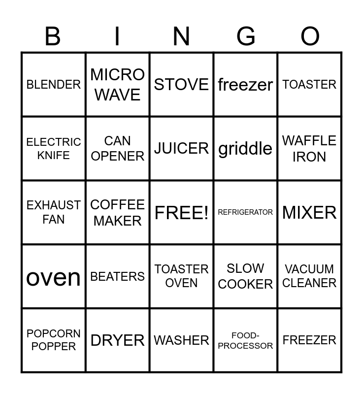 This bingo card has a free space and 24 words: BEATERS, DRYER, JUICER, POPCORN POPPER, TOASTER, BLENDER, ELECTRIC KNIFE, MICRO WAVE, REFRIGERATOR, TOASTER OVEN, griddle, EXHAUST FAN, SLOW COOKER, VACUUM CLEANER, CAN OPENER, FOOD- PROCESSOR, MIXER, STOVE, WAFFLE IRON, COFFEE MAKER, FREEZER, oven, freezer and WASHER.
