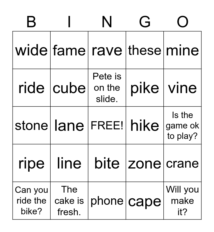 This bingo card has a free space and 24 words: Can you ride the bike?, line, Pete is on the slide., cape, mine, wide, fame, rave, hike, Is the game ok to play?, stone, cube, zone, crane, ride, The cake is fresh., phone, these, vine, ripe, lane, bite, pike and Will you make it?.