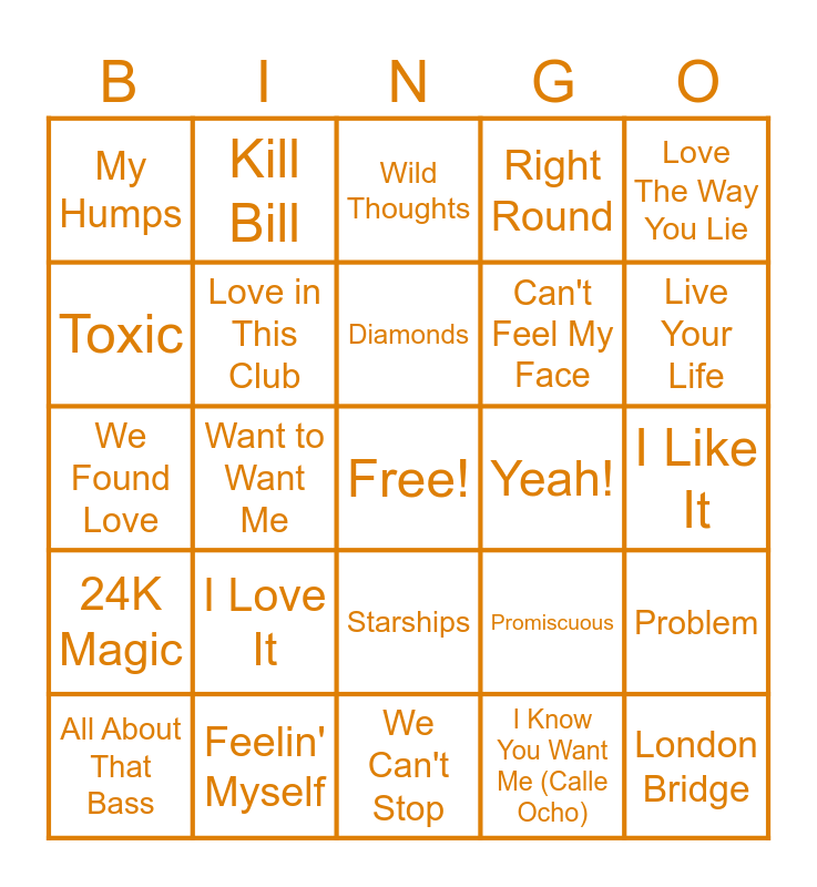 This bingo card has a free space and 46 words: TikTok, London Bridge, Royals, We Can't Stop, I Love It, S&M, Kill Bill, Poker Face, Toxic, Umbrella, Love in This Club, Right Round, Problem, Promiscuous, Black Widow, Low, Diamonds, Yeah!, Titanium, Love The Way You Lie, Want to Want Me, I Know You Want Me (Calle Ocho), My Humps, Can't Feel My Face, Temperature, Live Your Life, All About That Bass, No Scrubs, Starships, 24K Magic, Work It, Turn Down for What, Jumpin', Jumpin', Irreplaceable, Bad Girls, Feelin' Myself, I Like It, Bottoms Up, What Goes Around Comes Around, Let Me Blow Ya Mind, Down On Me, Wild Thoughts, We Found Love, Oh, Waiting for Tonight and Dark Horse.