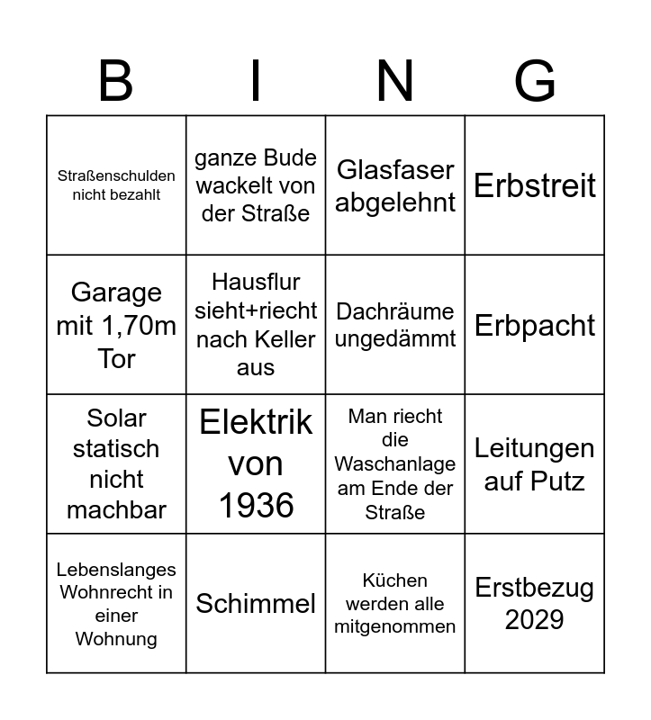This bingo card has 16 words: Schimmel, Leitungen auf Putz, Glasfaser abgelehnt, Straßenschulden nicht bezahlt, Solar statisch nicht machbar, ganze Bude wackelt von der Straße, Man riecht die Waschanlage am Ende der Straße, Küchen werden alle mitgenommen, Garage mit 1,70m Tor, Hausflur sieht+riecht nach Keller aus, Lebenslanges Wohnrecht in einer Wohnung, Erbstreit, Elektrik von 1936, Erbpacht, Dachräume ungedämmt and Erstbezug 2029.