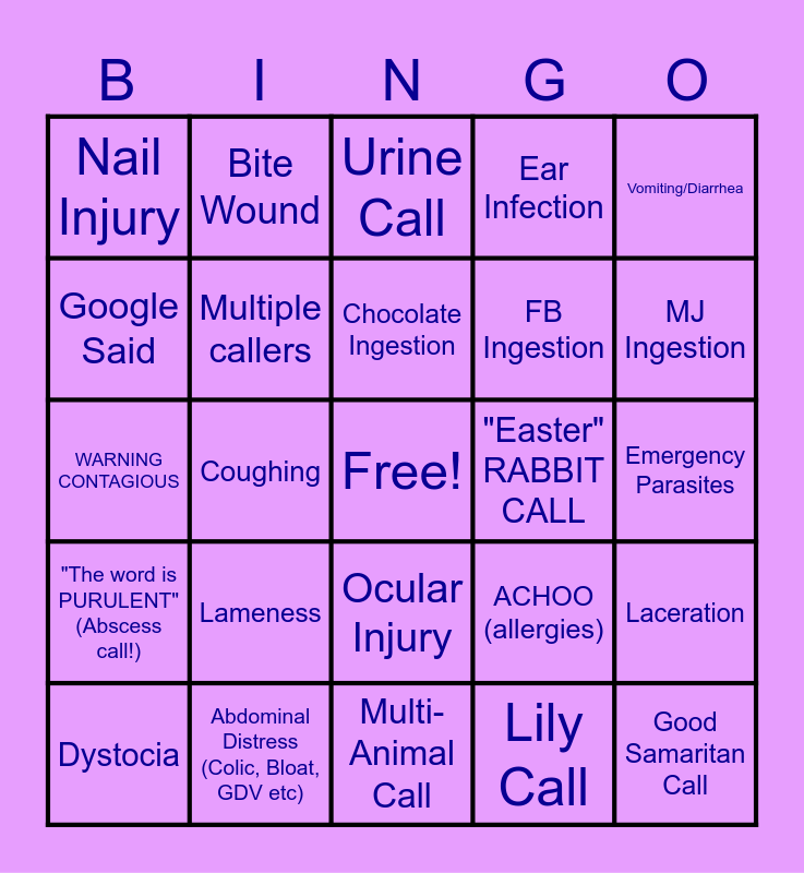 This bingo card has a free space and 24 words: Dystocia, Lameness, Chocolate Ingestion, Lily Call, Vomiting/Diarrhea, Nail Injury, Bite Wound, Urine Call, "Easter" RABBIT CALL, Emergency Parasites, WARNING CONTAGIOUS, Multiple callers, ACHOO (allergies), Laceration, Google Said, Abdominal Distress (Colic, Bloat, GDV etc), Multi-Animal Call, Ear Infection, MJ Ingestion, "The word is PURULENT"(Abscess call!), Coughing, Ocular Injury, FB Ingestion and Good Samaritan Call.