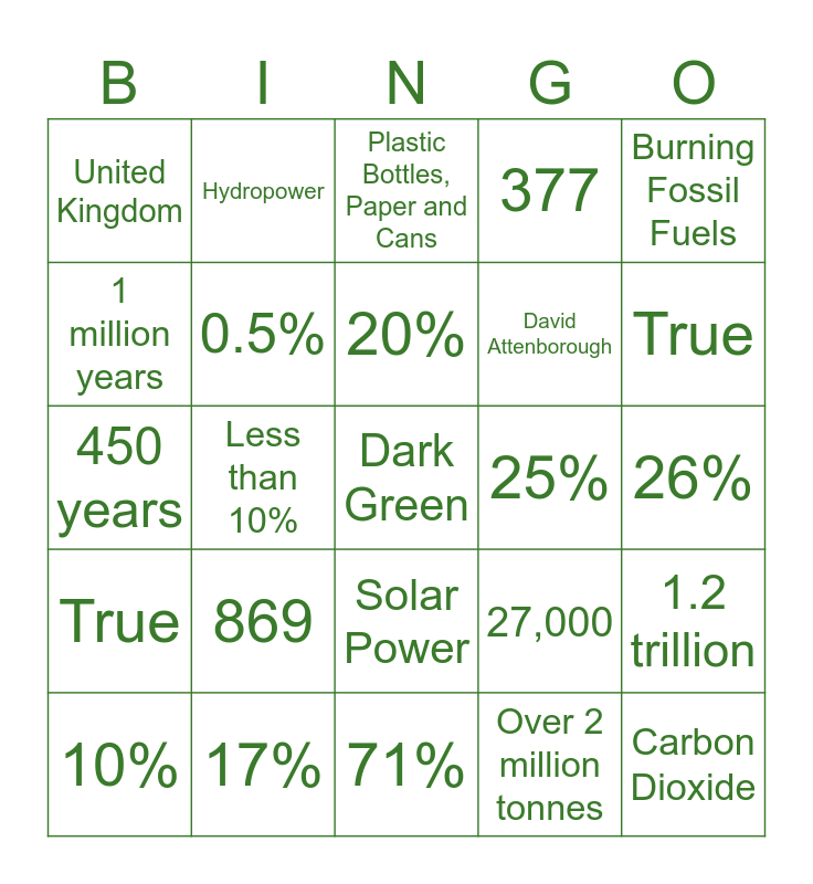 This bingo card has 30 words: 17%, China, Less than 10%, 6 times, United Kingdom, Plastic Bottles, Paper and Cans, 0.5%, Solar Power, 25%, 71%, 26%, Dark Green, Over 2 million tonnes, Carbon Dioxide, True, False or misleading environmental claims, 27,000, True, 869, Burning Fossil Fuels, 450 years, 75 to 199 million tonnes, Hydropower, David Attenborough, 1 million years, 377, 1.2 trillion, 10%, 20% and 2.4 trillion tonnes of CO2.