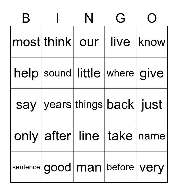 This bingo card has 36 words: Free!, over, new, sound, take, only, little, work, know, place, years, live, me, back, give, most, very, after, things, our, just, name, good, sentence, man, think, say, great, where, help, through, much, before, line, right and too.