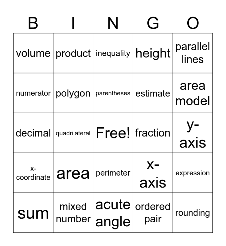 This bingo card has a free space and 25 words: area, acute angle, parentheses, sum, parallel lines, volume, numerator, product, fraction, perimeter, estimate, decimal, x-axis, expression, polygon, right angle, y-axis, inequality, area model, quadrilateral, rounding, mixed number, x-coordinate, height and ordered pair.
