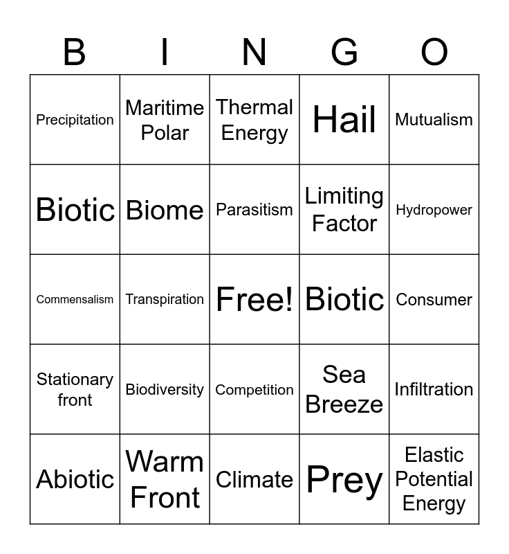 This bingo card has a free space and 79 words: Chemical Energy, Sound Energy, Thermal Energy, Light Energy, Conductor, Convection, Conduction, Radiation, Barometer, Anemometer, Humidity, Snow, Hail, Precipitation, Front, Biotic, Abiotic, Biodiversity, Producer, Consumer, Decomposer, Mutualism, Commensalism, Parasitism, Biome, Biodiversity, Biomass, Renewable Resource, Nonrenewable Resource, Fossil Fuel, Hydropower, Weather, Climate, Food Web, Abiotic, Biotic, Cold Front, Warm Front, Gravitational Potential Energy, Elastic Potential Energy, Density, Salinity, Temperature, Coriolis Effect, Decomposer, Maritime Polar, Maritime Tropical, Continental Tropical, Continental Polar, Humidity, Infiltration, Transpiration, Sea Breeze, Land Breeze, Aquifer, Primary Consumer, Secondary Consumer, Tertiary Consumer, Carrying Capacity, Competition, Limiting Factor, Transpiration, Condensation, Deep Currents, Surface Currents, Jet stream, Local winds, Global winds, Occluded front, Stationary front, Warm Front, Cold front, High pressure system, Low pressure system, Predator, Prey, Windward side, Leeward side and Water Cycle.