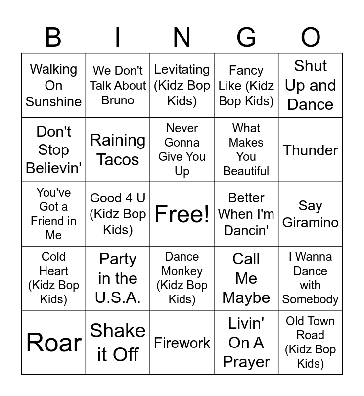 This bingo card has a free space and 24 words: Party in the U.S.A., Shake it Off, Never Gonna Give You Up, Roar, Shut Up and Dance, Walking On Sunshine, Don't Stop Believin', We Don't Talk About Bruno, Better When I'm Dancin', Dance Monkey (Kidz Bop Kids), What Makes You Beautiful, You've Got a Friend in Me, Call Me Maybe, I Wanna Dance with Somebody, Raining Tacos, Livin' On A Prayer, Say Giramino, Levitating (Kidz Bop Kids), Thunder, Good 4 U (Kidz Bop Kids), Old Town Road (Kidz Bop Kids), Cold Heart (Kidz Bop Kids), Fancy Like (Kidz Bop Kids) and Firework.