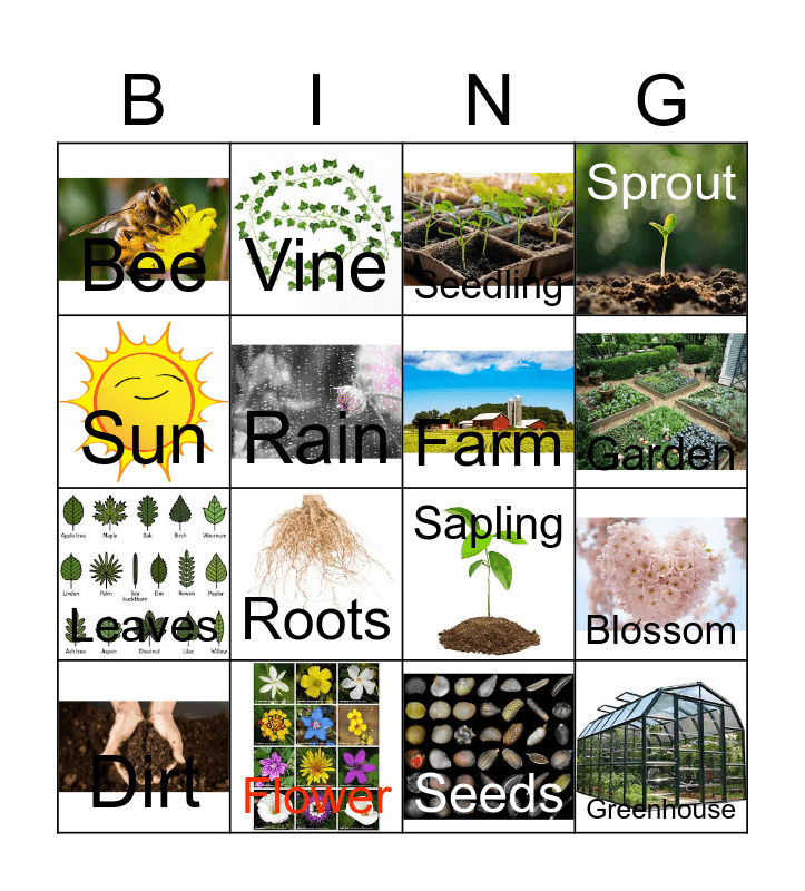 This bingo card has 16 images and 16 words: Flower, Blossom, Seedling, Bee, Leaves, Vine, Sapling, Seeds, Sun, Rain, Dirt, Sprout, Roots, Garden, Farm and Greenhouse.