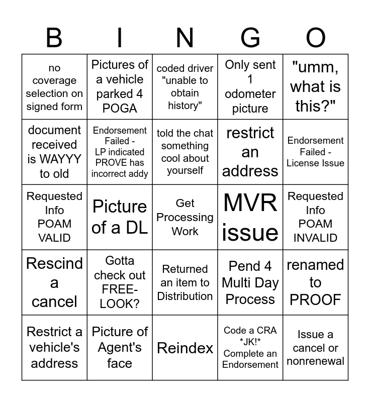 This bingo card has a free space and 44 words: Requested Info POGA VALID, Issue a cancel or nonrenewal, Form missing signature, Restrict a vehicle's address, why do you want to remove your email address?, Code a CRA *JK!* Complete an Endorsement, coded driver "unable to obtain history", AOR - NI thinks they can go from Direct 2 Agency, "umm, what is this?", Picture of Agent's face, Only sent 1 odometer picture, MVR issue, Returned an item to Distribution, Gotta check out FREE-LOOK?, "I cant read this" [document Illegible], Reindex, Mature/Safety Driving Discount added, Requested Info POAM VALID, Accident or Violation dispute, Endorsement Failed - License Issue, Pictures of a vehicle parked 4 POGA, NI sent in the same thing multiple times, Agent sent in documents for no reason, no coverage selection on signed form, Requested Info POGA INVALID, Requested Info POAM INVALID, Endorsement Failed - UNABLE TO SYMBOL, Renamed to PV - PV Requested Info, Pend 4 Multi Day Process, Rescind a cancel, Set a policy up for UWT cancel, renamed to PROOF, "NOPE" Unacceptable Risk, USED DDB {agent marketing}, Picture of a DL, Had to use PCV, Good Student Discount added, divorce documents, told the chat something cool about yourself, document received is WAYYY to old, restrict an address, POGA just 1 of 2 docs received, Endorsement Failed - LP indicated PROVE has incorrect addy and S2008 Vehicles.