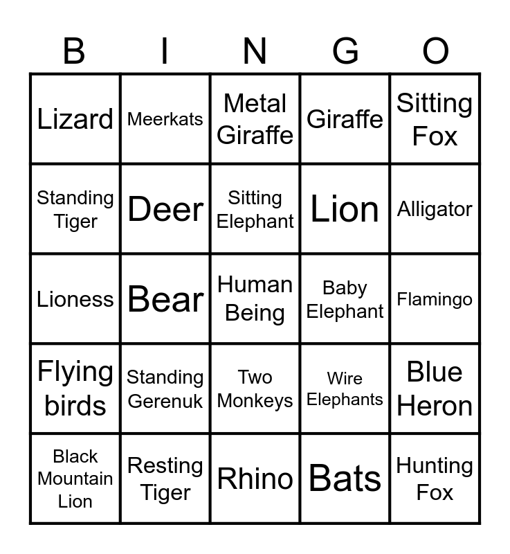 This bingo card has a free space and 27 words: Wire Elephants, Orangutan, Lion, Rhino, Standing Tiger, Metal Giraffe, Meerkats, Flying birds, Baby Elephant, Blue Heron, Lioness, Giraffe, Black Mountain Lion, Resting Tiger, Alligator, Turtle, Deer, Sitting Elephant, Standing Gerenuk, Lizard, Flamingo, Bats, Bear, Hunting Fox, Two Monkeys, Sitting Fox and Eagle.