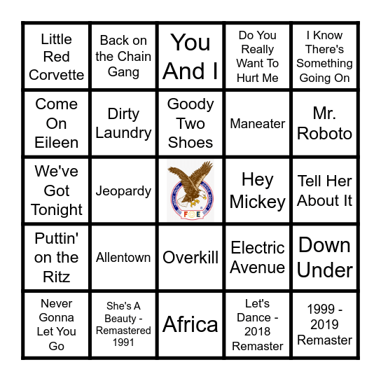 This bingo card has a free space and 49 words: (Keep Feeling) Fascination, 1999 - 2019 Remaster, Affair of the Heart, Africa, Allentown, Always Something There to Remind Me - 2018 Remaster, Back on the Chain Gang, Beat It, Come On Eileen, Der Kommissar, Dirty Laundry, Do You Really Want To Hurt Me, Down Under, Electric Avenue, Every Breath You Take, Flashdance...What a Feeling - Radio Edit, Goody Two Shoes, Hey Mickey, Hungry Like the Wolf - 2009 Remaster, I Know There's Something Going On, Jeopardy, Let's Dance - 2018 Remaster, Little Red Corvette, Maneater, Maniac, Mr. Roboto, Never Gonna Let You Go, One On One, Overkill, Puttin' on the Ritz, Separate Ways (Worlds Apart) [2024 Remaster], Sexual Healing, Shame On The Moon, She Blinded Me With Science, She's A Beauty - Remastered 1991, Stand Back, Stray Cat Strut, Sweet Dreams (Are Made of This), Tell Her About It, The Safety Dance, Time (Clock Of The Heart), Total Eclipse of the Heart, Twilight Zone, Up Where We Belong - From An Officer And A Gentleman, We've Got Tonight, You And I, You Are, You Can't Hurry Love - 2016 Remaster and Your Love Is Driving Me Crazy.