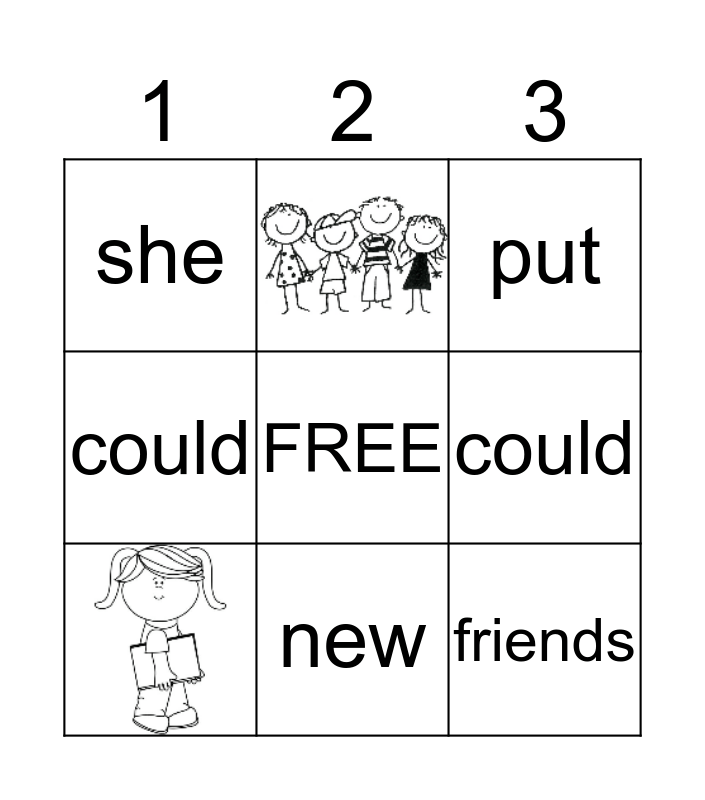 This bingo card has 2 images, a free space and 6 words: could, put, she, friends, could and new.