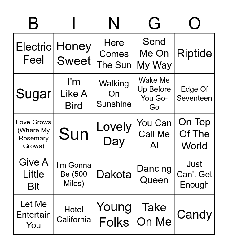 This bingo card has 75 words: I Want Candy, My Boy Lollipop, Here Comes The Sun, Silver Springs, Flowers In Your Hair, Dancing In The Dark, Sunflower, Vol. 6, Golden, T-Shirt Weather, Flowers, Candy, Sweet Caroline, Walking On Sunshine, Sugar, Wouldn't It Be Nice, Sun, In The Morning, Lovely Day, Dog Days Are Over, Riptide, Malibu, Love Grows (Where My Rosemary Grows), I'm Like A Bird, Honey Sweet, Send Me On My Way, Grace Kelly, Dancing In The Moonlight, Piano Man, Beautiful Day, The Chain, Don't You (Forget About Me), We Didn't Start The Fire, Friday I'm In Love, Dancing Queen, Edge Of Seventeen, Wake Me Up Before You Go-Go, Uptown Funk, Espresso, On Top Of The World, Take On Me, Mamma Mia, We Built This City, Everybody Wants To Rule The World, 9 To 5, I Wanna Dance With Somebody, Girls Just Want To Have Fun, Let Me Entertain You, Electric Feel, Teardrops, One More Time, Livin' La Vida Loca, Dakota, Bits And Pieces, Young Hearts Run Free, Uptown Girl, Africa, Don't Go Breaking My Heart, Human, Tubthumping, Come On Eileen, I'm Gonna Be (500 Miles), Escape (The Pina Colada Song), Video Killed The Radio Star, Mr. Blue Sky, Alright, You Can Call Me Al, Kokomo, Surfin' U.S.A., Mrs. Robinson, Just Can't Get Enough, Give A Little Bit, Hotel California, Chelsea Dagger, Young Folks and Little Talks.