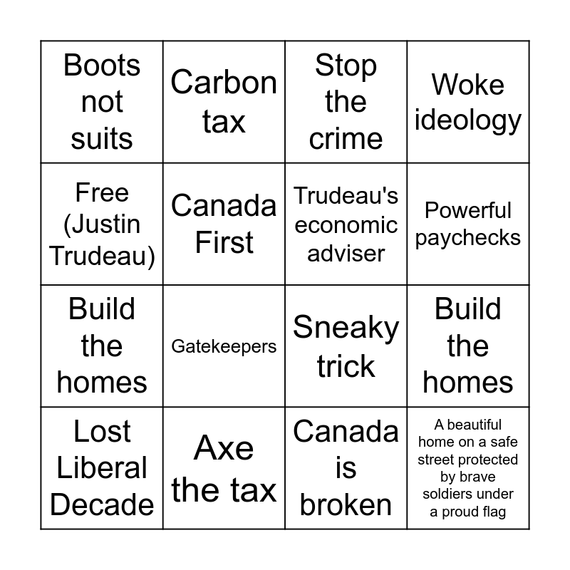 This bingo card has 16 words: Axe the tax, Build the homes, Stop the crime, Boots not suits, Build the homes, Carbon tax, Sneaky trick, Canada is broken, Free (Justin Trudeau), Canada First, Lost Liberal Decade, Woke ideology, Gatekeepers, Powerful paychecks, Trudeau's economic adviser and A beautiful home on a safe street protected by brave soldiers under a proud flag.
