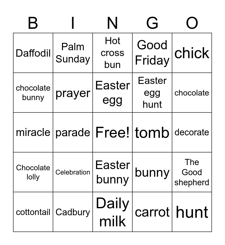 This bingo card has a free space and 75 words: Lamb, Ashes, Hot cross bun, Fish on Friday, Last supper, Sacrifice, risen, God, Easter, April, bonnet, Easter basket, Easter egg, chocolate bunny, basket, parade, rabbit, hunt, celebration, chick, Jesus, miracle, prayer, Palm Sunday, Good Friday, Easter Service, crucifixion, crucify, resurrection, cross, holy, Lent, bouquet, bunny, chocolate, Easter egg hunt, Happy Easter!, Ash Wednesday, decorate, carrot, dye, hide, tradition, holiday, find, egg, cottontail, Daffodil, Flowers, Yellow, Kids, Easter bunny, Passover, Holy Week, Christian, New Testament, Gospel, Blood of Christ, Family, Jerusalem, Celebration, Warmer weather, Rituals, Spring, Son of god, tomb, Apostoles, Blessing, Jehovah, The Good shepherd, Chocolate lolly, Cadbury, Lindt, Daily milk and White chocolate.